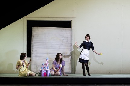 Деннис Ореллана (Ирина) — светлый изящный контратенор полностью укладывается в эстетику спектакля: в этом прочтении нет пола, нет возраста, лишь капризная незрелость, нервная растерянность и бестолковая пустота.