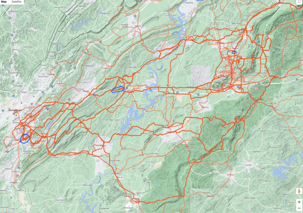 Adventure 2 – Analise Rendezvous post-fall semester – I attempted a 540 mile one way commute (again to be split up into two Eddington 256 rides) from Birmingham to Bristol, Virginia to meet Analise on her drive home from college. Nasty rain and storms diverted me off the route to the safe side of the mountains and only made it to the far side of Knoxville. Grand total: 1 Eddington 256 ride, 0 new counties, and 0 new county high points – 367 miles.