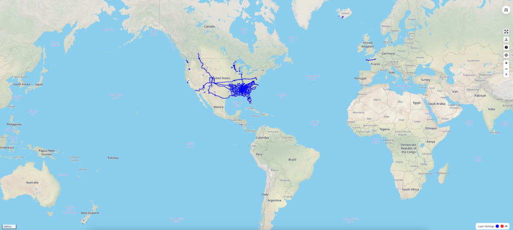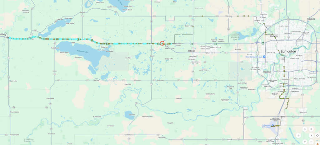 As far as traffic goes, you can see in the image above my journey up from the airport. Each green circle represents a car passing at normal speeds. Each teal colored circle represents a vehicle (most likely a truck) going more than 50mph faster than my current speed. You can see how relatively deserted my route northwest of Edmonton was from 1am – 3am, but how dramatically busy Trans Canada Highway 16 was starting from 4:50AM when I first joined it.