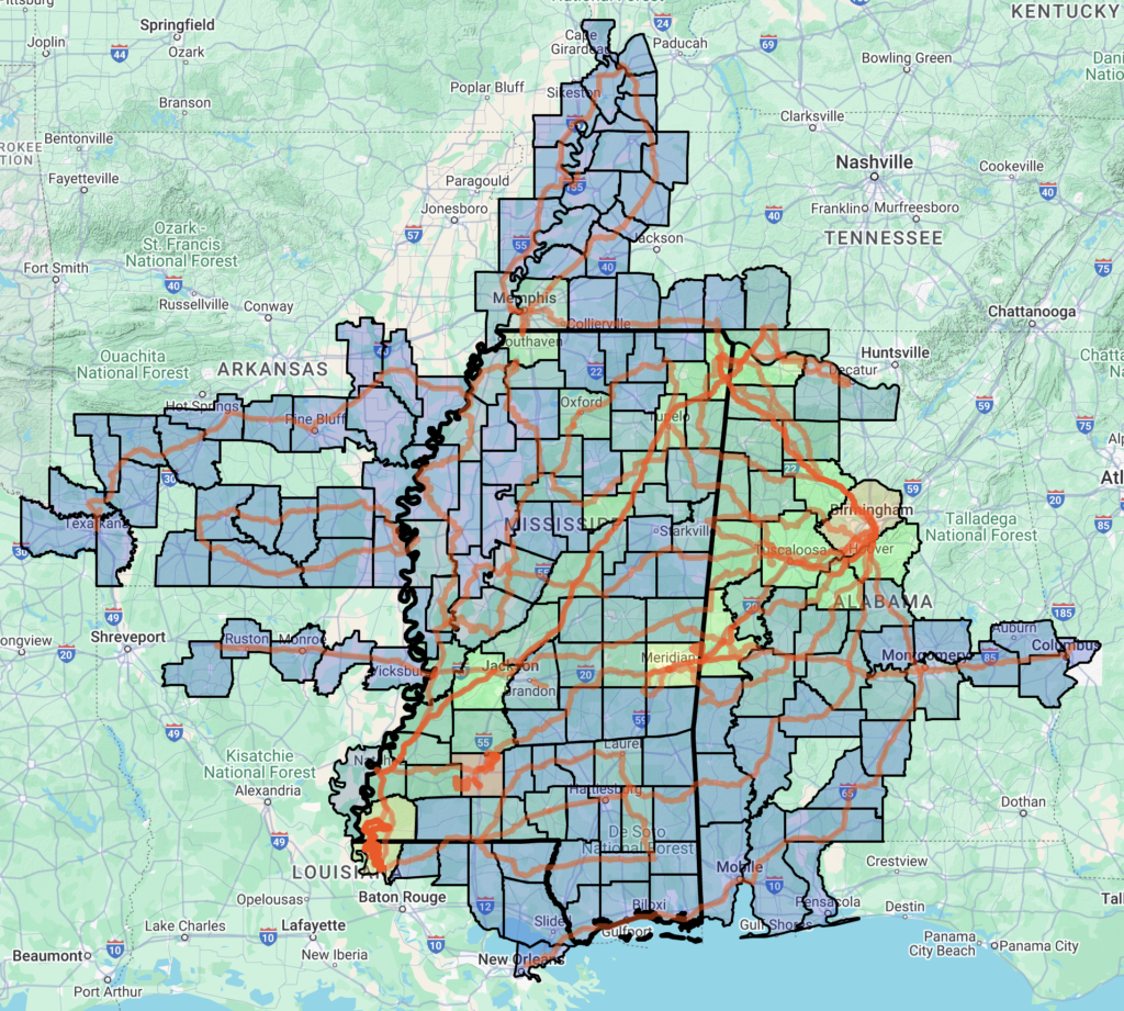 The last stretch through Mississippi involved daily afternoon thunderstorms I tried to finish ahead of or wait out or ride through. This at least kept the heat to more manageable levels. On the final long day I had planned, the afternoon thunderstorms never stopped so I got a hotel in Tuscaloosa rather than trying to ride through the rain all night long, which would have been dangerous and miserable way to finish the ride.