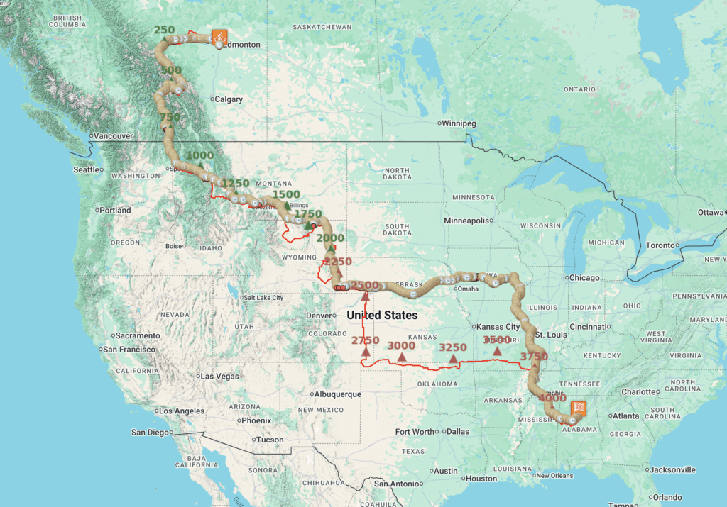 Absolutely amazing scenery with glacier covered mountain after glacier covered mountain and lots of rain in Canada eventually giving way to the “heat dome” that was affecting the east coast and central part of the USA and causing a very strong south wind which prevented me from making my way down through Eastern Colorado where I would have been battling a 20-30mph sustained headwind. Instead I opted to veer in a northeasterly direction so that I enjoyed a tailwind and cross-tailwind for a day before turning more eastward and a nasty battle with a crosswind. The map below shows my intended route (red) vs the actual route (little clock icons from my satellite tracker): https://pickuta.com/album/323