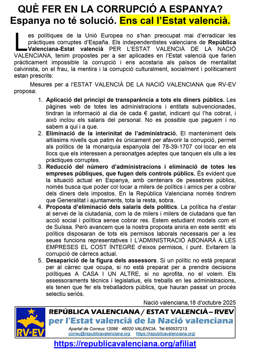 Les polítiques de la Unió Europea no s’han preocupat mai d’erradicar les pràctiques corruptes d’España. Els independentistes valencians de República Valenciana-Estat valencià PER L’ESTAT VALENCIÀ DE LA NACIÓ VALENCIANA, tenim propostes per a ser aplicades en l’Estat valencià que farien pràcticament impossible la corrupció i ens acostaria als països de mentalitat calvinista, on el frau, la mentira i la corrupció culturalment, socialment i políticament estan prescrits:
