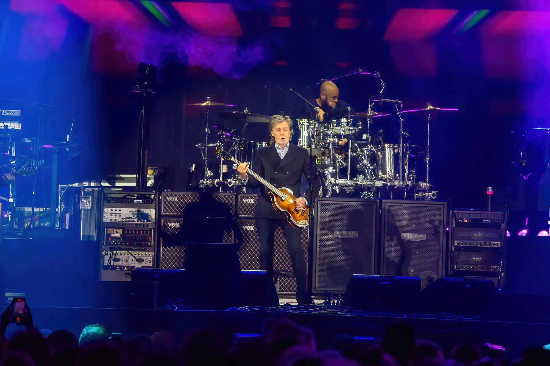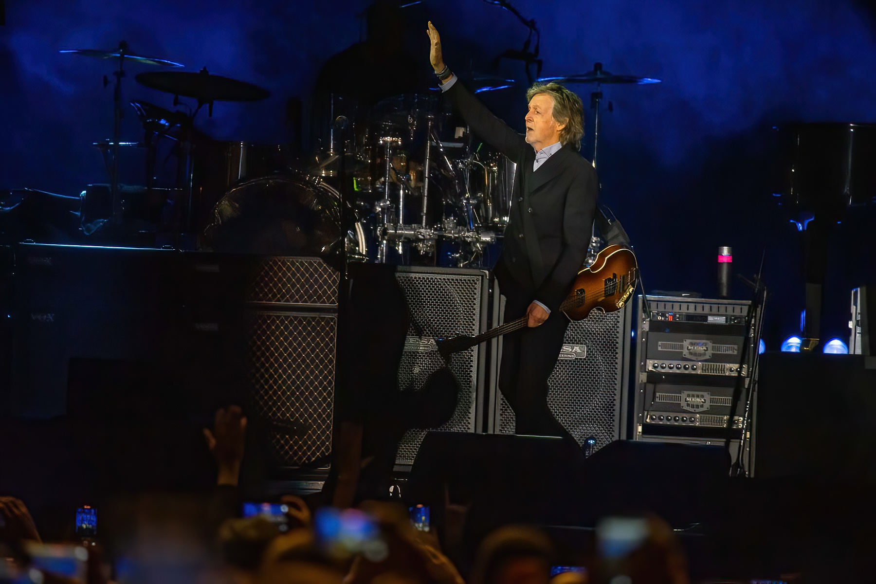 The house music cut off as the stadium lights went dark, the low din that had been rolling through arena became a deafening roar, a desperate collective cry in the darkness half-crazed by love and time. Almost impossibly, the crowd managed to go up another few octaves as, lights still dimmed, Sir Paul McCartney walked out on stage, iconic Höfner bass in one hand, his other raised into a wave that became a fist. It felt like something out of a recording of a vintage Beatles show, tears streaming down the faces of many, arms reaching out towards the icon, older fans and young sharing in the excitement, the sheer ecstasy of the moment. McCartney’s band soon followed, Paul counted one-two-thee-four into the mic and they launched into the first song of the night: “Help!.”