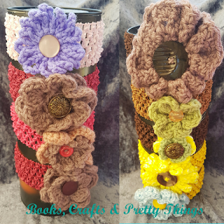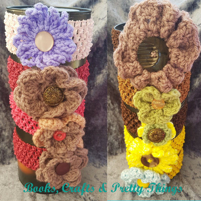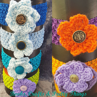 I crocheted all the flowers and used vintage buttons to attach them to pre-made bands I bought from Ebay.