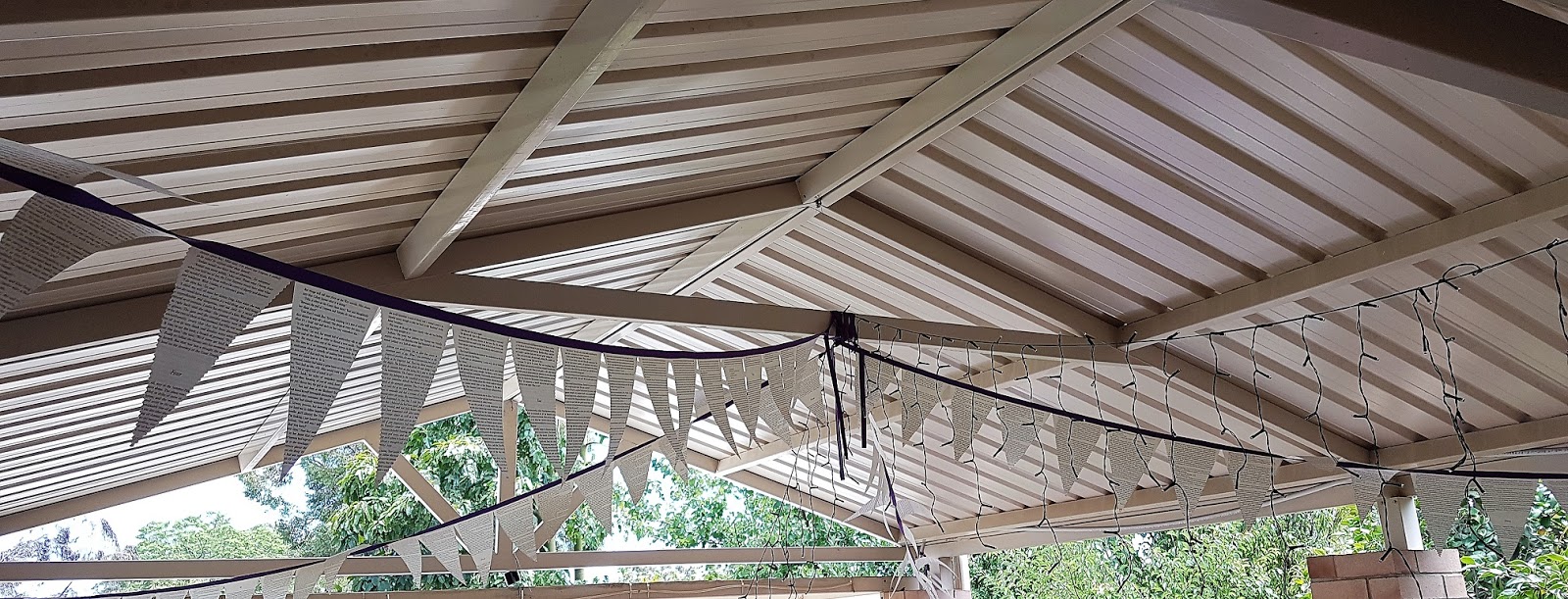My sister made some gorgeous decorations using book pages, including bunting, signs, table runners and platters. Details and links for some of the decorations are below.