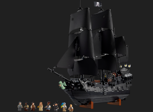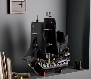 A 2,862-piece set loaded with features. Rotate dials to deploy the port or starboard cannons, turn the ship’s wheel to steer the rudder, and open the deck to reveal the detailed captain’s quarters, complete with furnishings, candlesticks, and an apple. Additional elements include a detachable rowboat and a minifigure figurehead. The hull can also be separated at the waterline to depict the ship in full sailing mode.